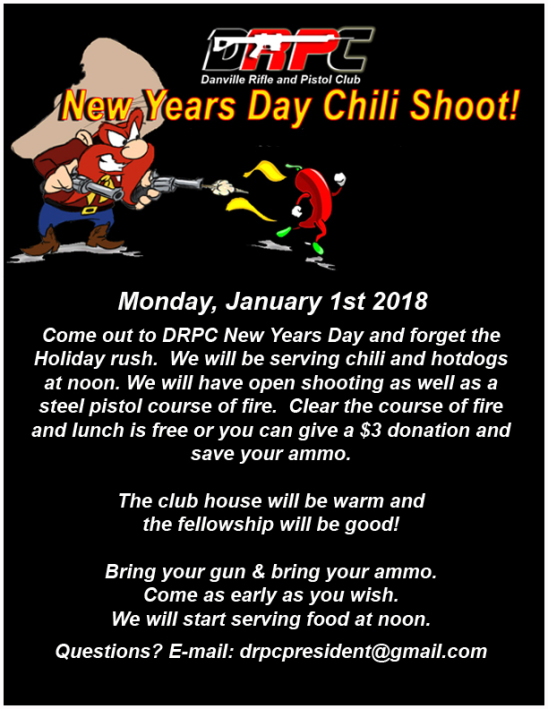 Here is your chance to start the New Year with a "Bang"! Come on out to the range, bring a gun and do a little shooting and then enjoy the warmth of the club house along with some chili and hotdogs beginning at noon.